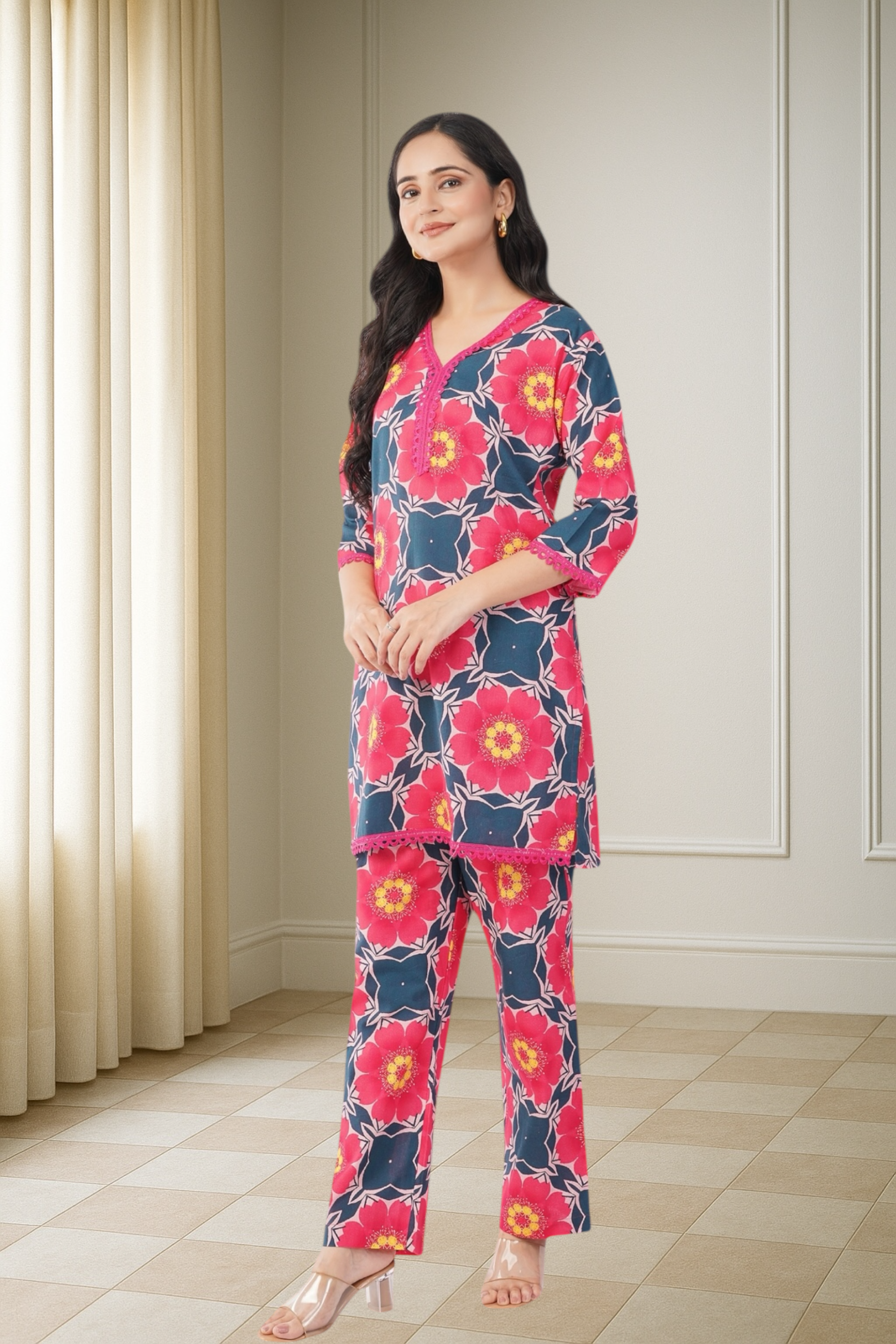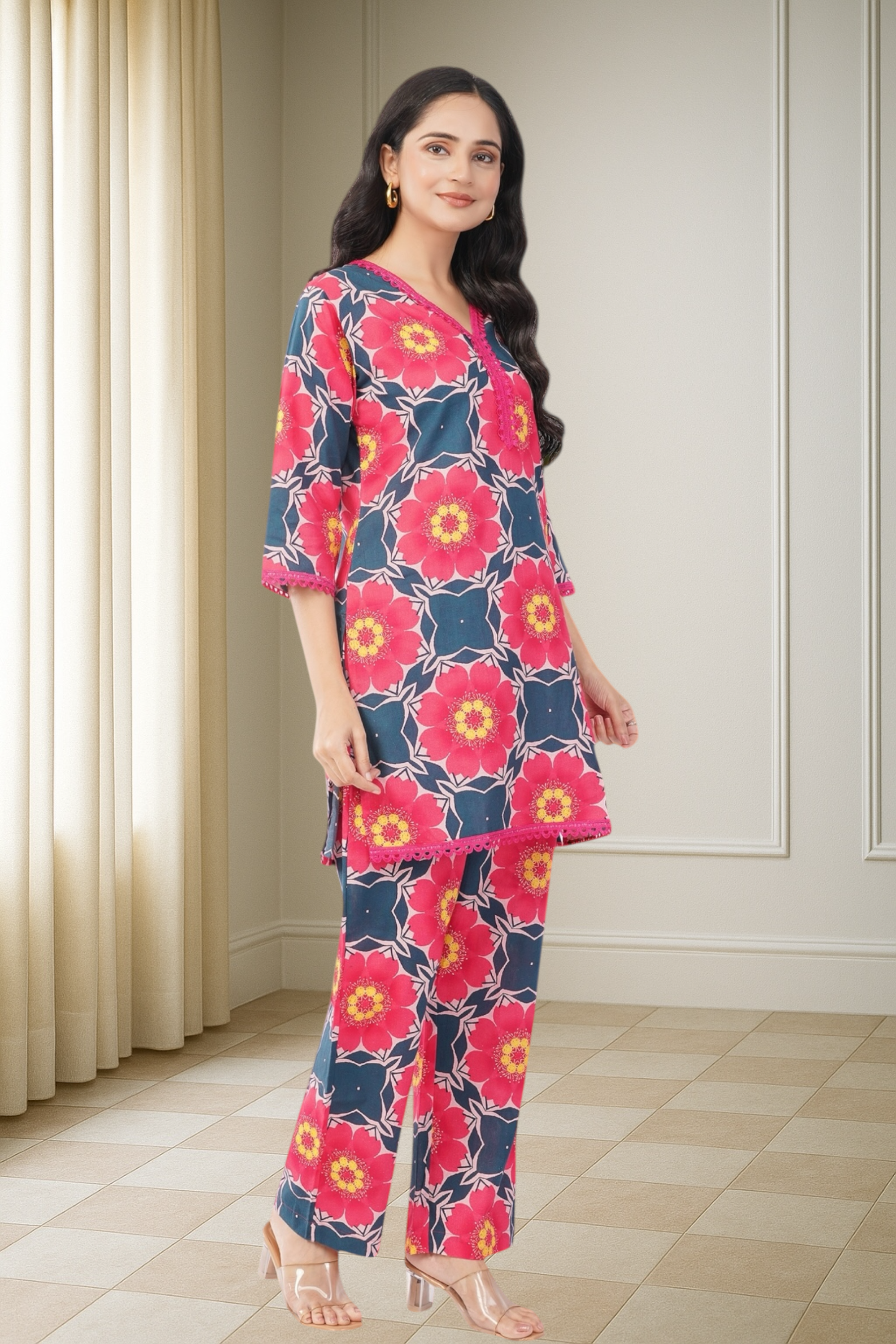 The fabric features a striking pinkish floral print with hints of yellow and teal, creating a rich and artistic pattern. The look is elevated with a bright pink lace-trimmed V-neckline.